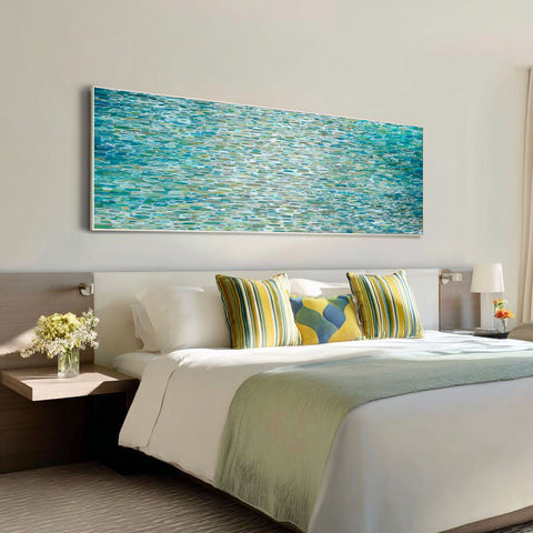 Tumbling underneath waves amidst effervescent aquatones, Margaret Juul's compositions are fresh and original expressions of the colors and patterns of water in motion.  The artist uses her imagination to distill the kinetic essence of something never at rest. Irregular shapes of green and blue cover the canvas, reminiscent of the brilliant marine hues that convey water in 19th century Japanese woodblock prints.  Close inspection reveals rough, textured surfaces from the thick application of media on linen, including oil, acrylic and oil pastel, reiterating the earthly and organic nature of her subject. Throughout her life, Margaret Juul has been privileged to enjoy a gift of inventive creativity. After training in fine art studies at Chicago’s Columbia College, she furthered her advanced education in interior design at The International Academy of Design and Technology.  By 2007, she had accumulated an extraordinary portfolio, as well as acceptance into the prestigious International Interior Design Association; specializing in color, custom textiles, décor and fine art selection. One of the highlights of her diverse artistic career came in 2009, when the Iraq Museum International requested her image “Rough Wake” for the International Poster Exhibition at their museum in Baghdad. ”Rough Wake” would remain on display there for nearly two years. A collection of the 'Reflections' series was acquired in March 2014 and added to the newly remodeled NYU Surgical Center Endocrine and Diabetes Suite at the main patient facility; 550 First Avenue, NYC. The work was procured directly through exclusive NYU Artists Acquisitions Department.  Not only was it was an honor, but also a high point in her career. Margaret’s artistic life has always been inspired by the Sea. From the shores of her New York birthplace and on to Chicago’s Lake Michigan- to the spectacular tropics of Tampa Bay where she currently resides, water has held an unwavering hold on her spirit — fluidity, intuition and reflective volatility.    As a successful professional artist and designer for more than two decades, she has cultivated a long list of devoted supporters. Her work displays prominently in a wide variety for settings—from celebrity homes, corporate lobbies, to commercial and hospitality sites internationally.