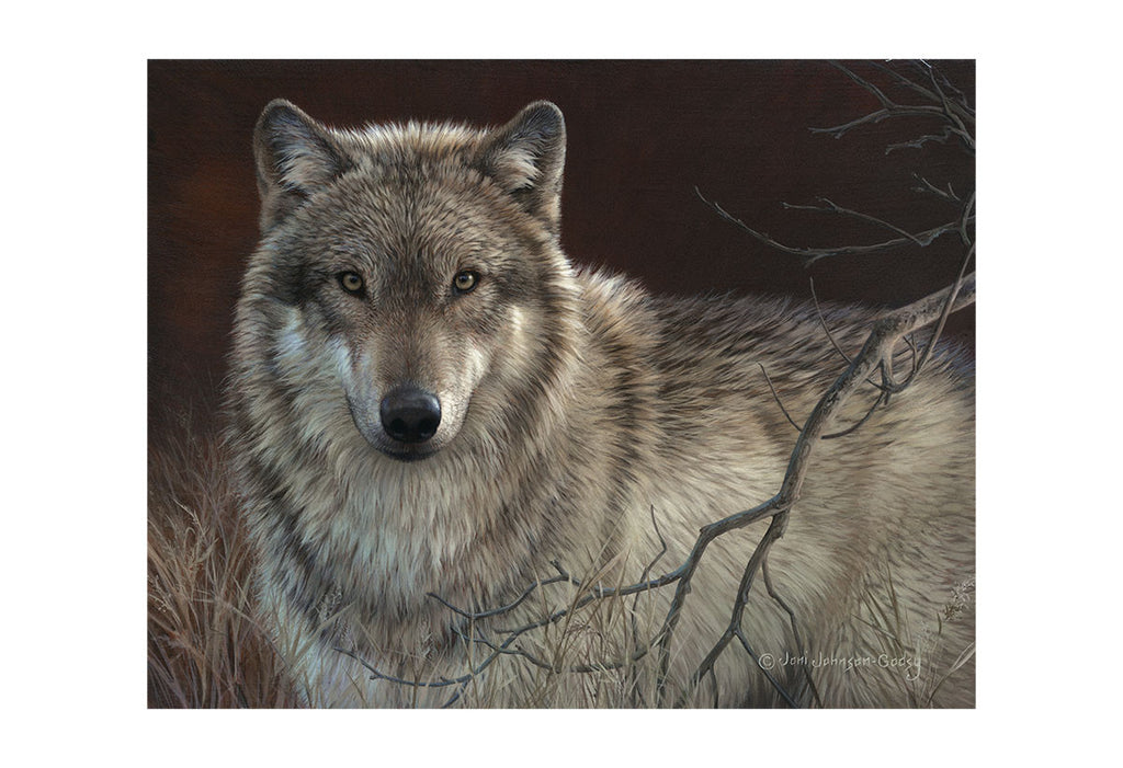 Joni Johnson-Godsy grew up in Ashland Ohio. Her love of animals started from her first memories as a child and was a passion that grew even stronger over time. In her youth she spent countless hours exploring the creeks and woods near her family’s home watching the wildlife that was typical in that part of the Midwest. Her curiosity about nature and love of the outdoors was inexhaustible. Joni studied fine art at Ohio State University and went on to art school at the Art Institute of Pittsburg, PA where she graduated with honors. Upon graduation she secured a position as greeting card illustrator with Hallmark Cards Inc. which required a re-location to the Kansas City area. During her early years at Hallmark, Joni focused her spare time on her love of dogs. She trained her own dogs (a Sheltie and Border Collies) for obedience, conformation and tracking trials hosted by the AKC (American Kennel Club). The art she did outside of her work at Hallmark reflected this love of dogs and won awards at numerous national art competitions, drawing the attention of the American Kennel Club who hired her to illustrate dogs for their magazine the AKC Gazette. Joni created illustrations for Hallmark Cards for twenty one years, having her work published and sold on Hallmark product in North America and Europe. As time passed, her artistic focus made the inevitable change to that of wildlife. In 2001 she decided that the time had come to dedicate her energies toward her passion for art and nature. She became a part-time employee at Hallmark, dividing her time between two very different artistic disciplines. Her wildlife paintings garnered immediate attention from national exhibitions and collectors and it became apparent that a full-time effort was needed to pursue this endeavor. Joni left Hallmark in the summer of 2006 to give her full attention to wildlife painting. Joni has traveled the world to gather reference materials for her paintings. In May of 2004 she and her husband Alan spent four weeks in southern Africa on photographic safari, traveling in the countries of Zambia, Botswana, and South Africa. It was a lifelong dream for Joni to see the great creatures of Africa living as they were meant to live in the wild. This trip has resulted in many paintings by which she hopes to stir the imaginations of anyone who dreams of that great land and shares her passion for it. Conservation is the driving force behind all that motivates Joni as she paints. “The world is changing so rapidly. In this highly technological world, I believe that each of us still has a hard-wired need to understand from where it is we once came. But for some of us it lies a little closer to the surface than for others. I see a new wisdom arising within us. We are awakening from a great slumber of ignorance, and are beginning to realize that we are indeed the keepers of this world we live in. There are more conservation groups, more people supporting them, and more and more people taking an active role in what they now realize is a valuable asset to our kind. If my paintings can in any way help people enjoy nature and keep it in the forefront of their minds, I will have been a small part of this shift in human consciousness. That is what my paintings are all about”.